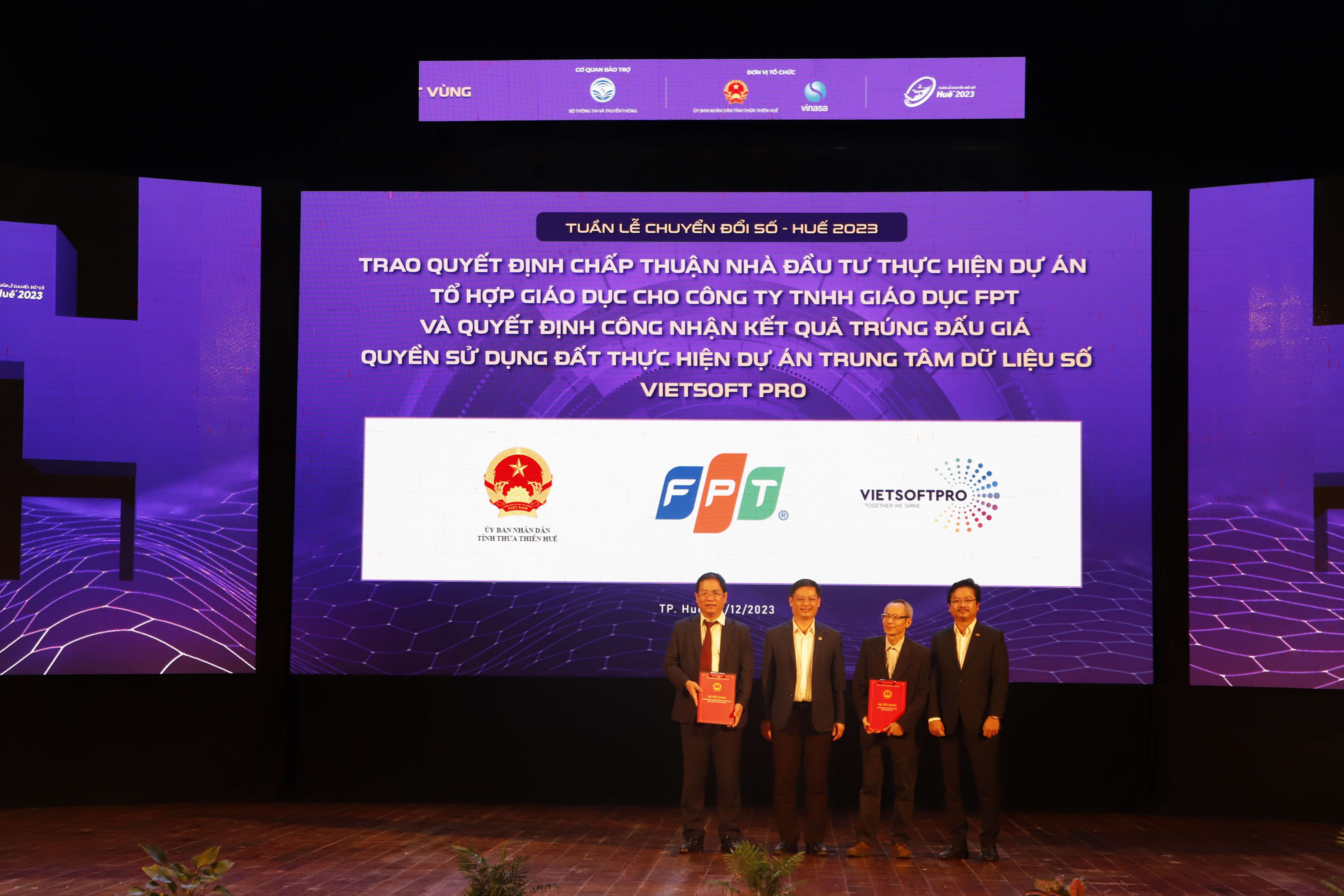 Dịp này, UBND tỉnh đã trao Quyết định chấp thuận nhà đầu tư thực hiện dự án Tổ hợp giáo dục cho Công ty TNHH Giáo dục FPT và Quyết định công nhận kết quả trúng đấu giá quyền sử dụng đất thực hiện dự án Trung tâm dữ liệu số cho Công ty cổ phần Vietsoft Pro (ảnh dưới).