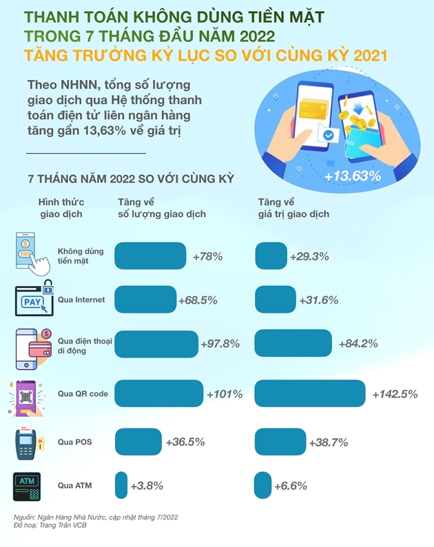 Biểu đồ về việc tăng trưởng thanh toán không dùng tiền mặt trong 7 tháng đầu năm 2022 so với cùng kỳ năm 2021