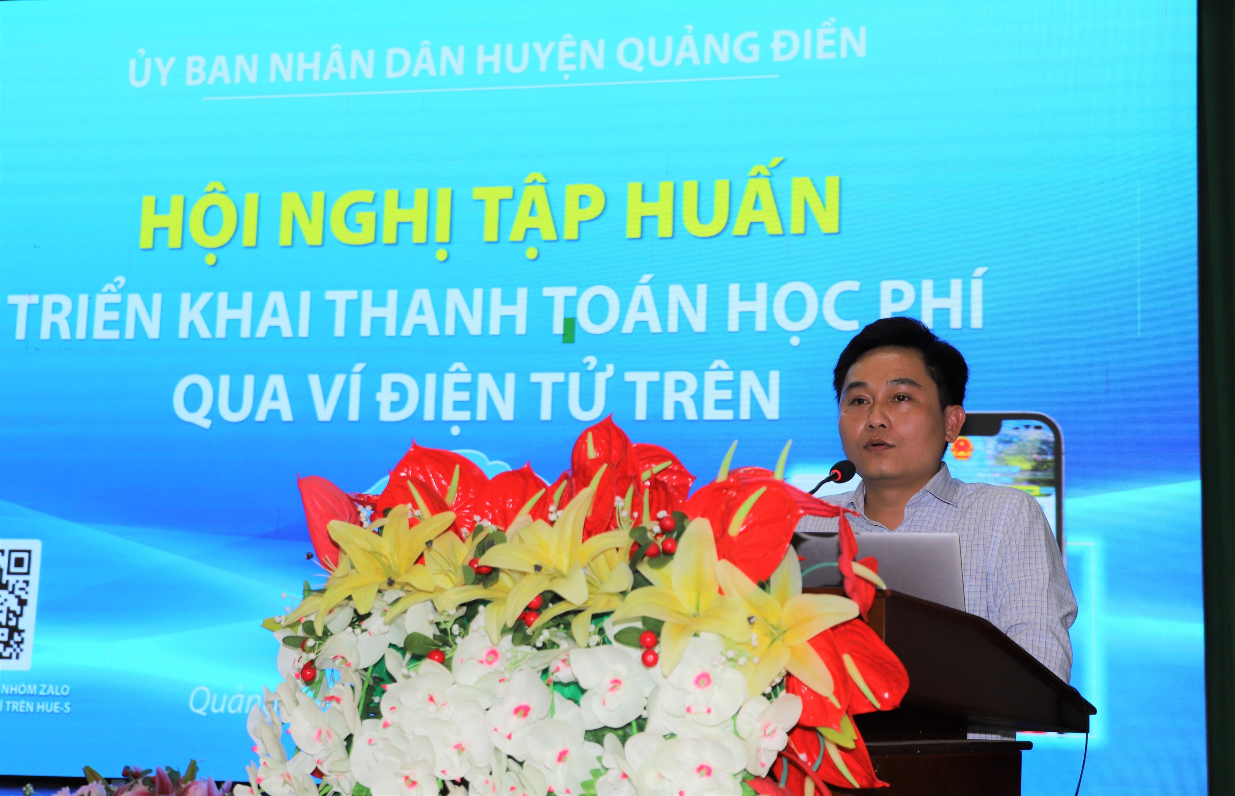 Phát biểu tại hội nghị, đồng chí Bùi Hoàng Minh - Giám đốc Trung tâm IOC mong muốn Phòng giáo dục và Đào tạo huyện Quảng Điền quan tâm, tích cực triển khai việc thanh toán học phí qua ví điện tử trên Hue-S cho các trường mầm non, tiểu học, trung học cơ sở trên địa bàn huyện. Tuyên truyền, vận động, khuyến khích phụ huynh thanh toán học phí trực tuyến qua ví điện tử trên Hue-S nhằm góp phần thúc đẩy phát triển hoạt động thanh toán không dùng tiền mặt trong ngành giáo dục nói riêng và thúc đẩy phát triển kinh tế số trên địa bàn tỉnh nói chung.