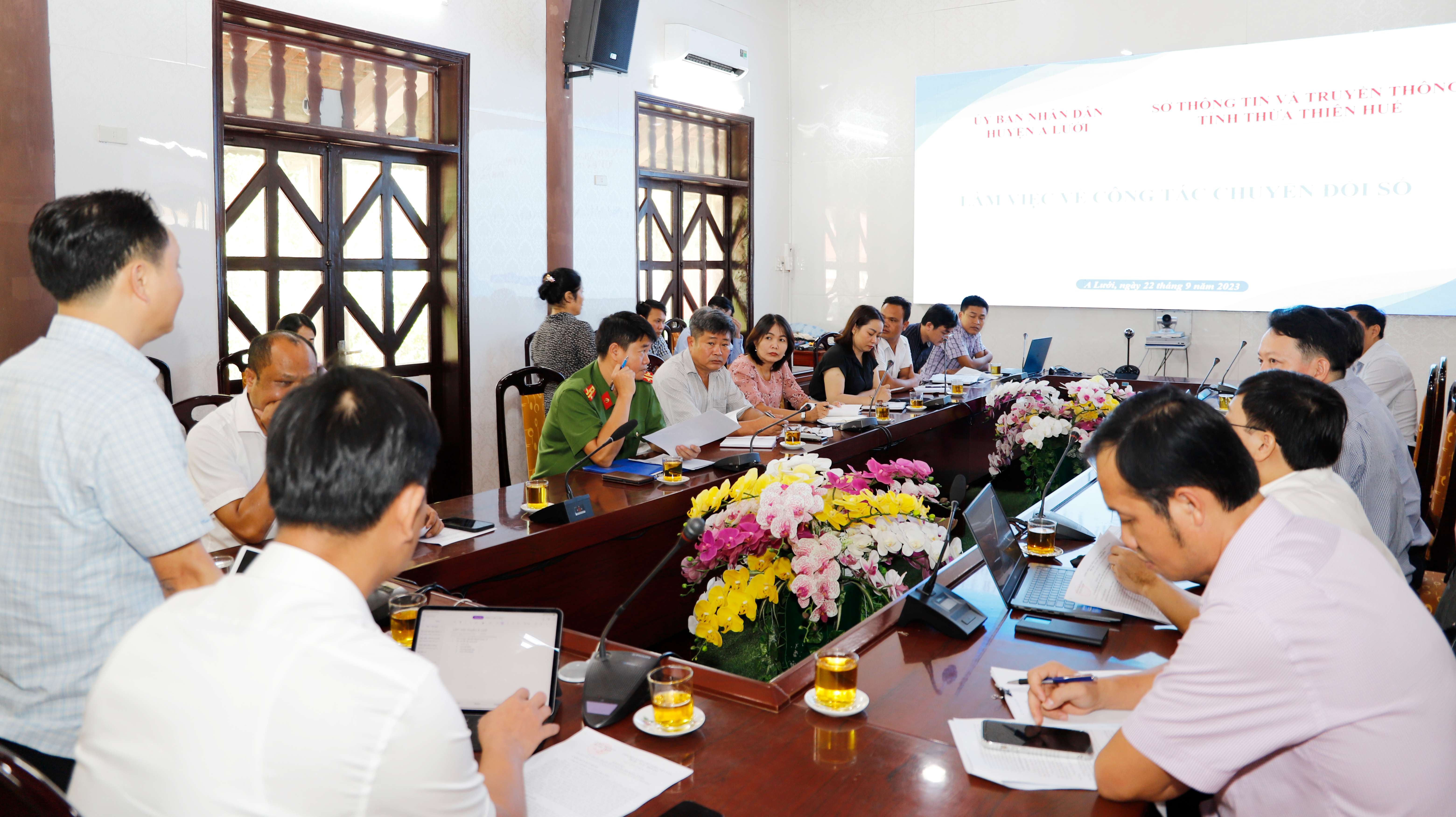 Tham dự buổi làm việc, về phía Sở Thông tin và Truyền thông có đồng chí Nguyễn Xuân Sơn, Phó trưởng Ban Chuyển đổi số tỉnh, Giám đốc Sở cùng lãnh đạo các phòng liên quan và Trung tâm IOC. Về phía UBND huyện A Lưới có đồng chí đồng chí Nguyễn Mạnh Hùng, Phó Bí thư Huyện ủy, chủ tịch UBND huyện; đồng chí Nguyễn Văn Hải, UVTVHU, Phó Chủ tịch UBND huyện; Đồng chí Lại Phước Lợi, UVTVHU, Trưởng Công an huyện cùng đại diện lãnh đạo các phòng ban, địa phương, đại diện lãnh đạo VNPT, Bưu điện huyện.