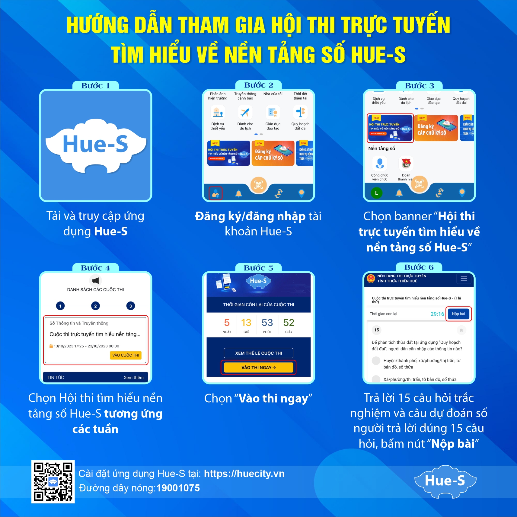Thí sinh tham gia dự thi qua ứng dụng Hue-S, thực hiện đăng nhập/đăng ký tài khoản, nhấn chọn vào banner chức năng Hội thi trực tuyến tìm hiểu về nền tảng số Hue-S để trả lời 15 câu hỏi trắc nghiệm và 01 câu hỏi dự đoán số người dự đoán đúng tất cả các câu hỏi.