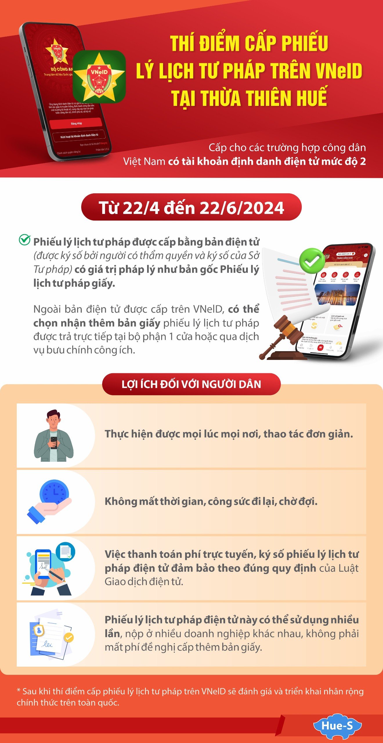 Người dân còn có thể chủ động đăng ký tại nhà chỉ với vài thao tác đơn giản chưa đầy 5 phút theo các bước hướng dẫn trên ứng dụng VNeID. Ngoài bản điện tử được cấp trên ứng dụng VNeID, người dân có thể chọn nhận thêm bản giấy phiếu lý lịch tư pháp được trả trực tiếp tại bộ phận một cửa hoặc qua dịch vụ bưu chính công ích.