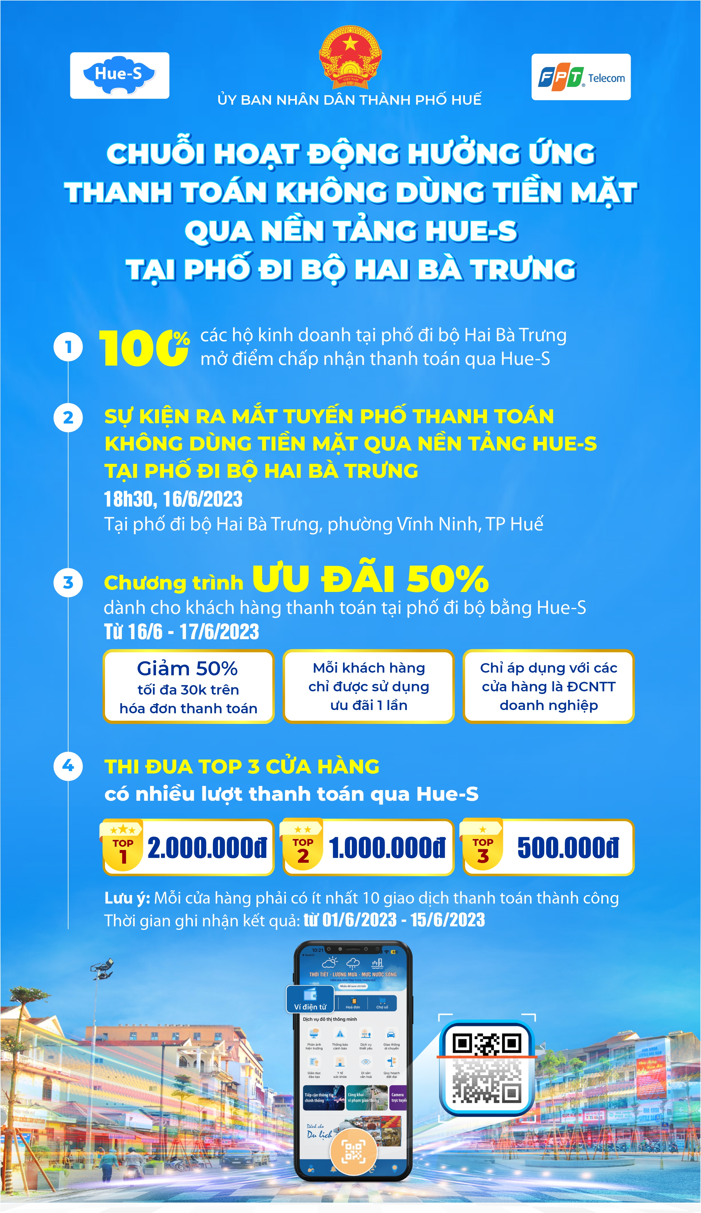 Nằm trong khuôn khổ Kế hoạch triển khai tuyến phố thanh toán không dùng tiền mặt qua nền tảng Hue-S tại phố đi bộ Hai Bà Trưng, UBND thành phố Huế phối hợp với Trung tâm Giám sát, điều hành đô thị thông minh (IOC) và Công ty FPT Telecom tổ chức Lễ ra mắt tuyến phố thanh toán không dùng tiền mặt qua nền tảng Hue-S vào ngày 16/6/2023 tại phố đi bộ Hai Bà Trưng, phường Vĩnh Ninh, thành phố Huế.