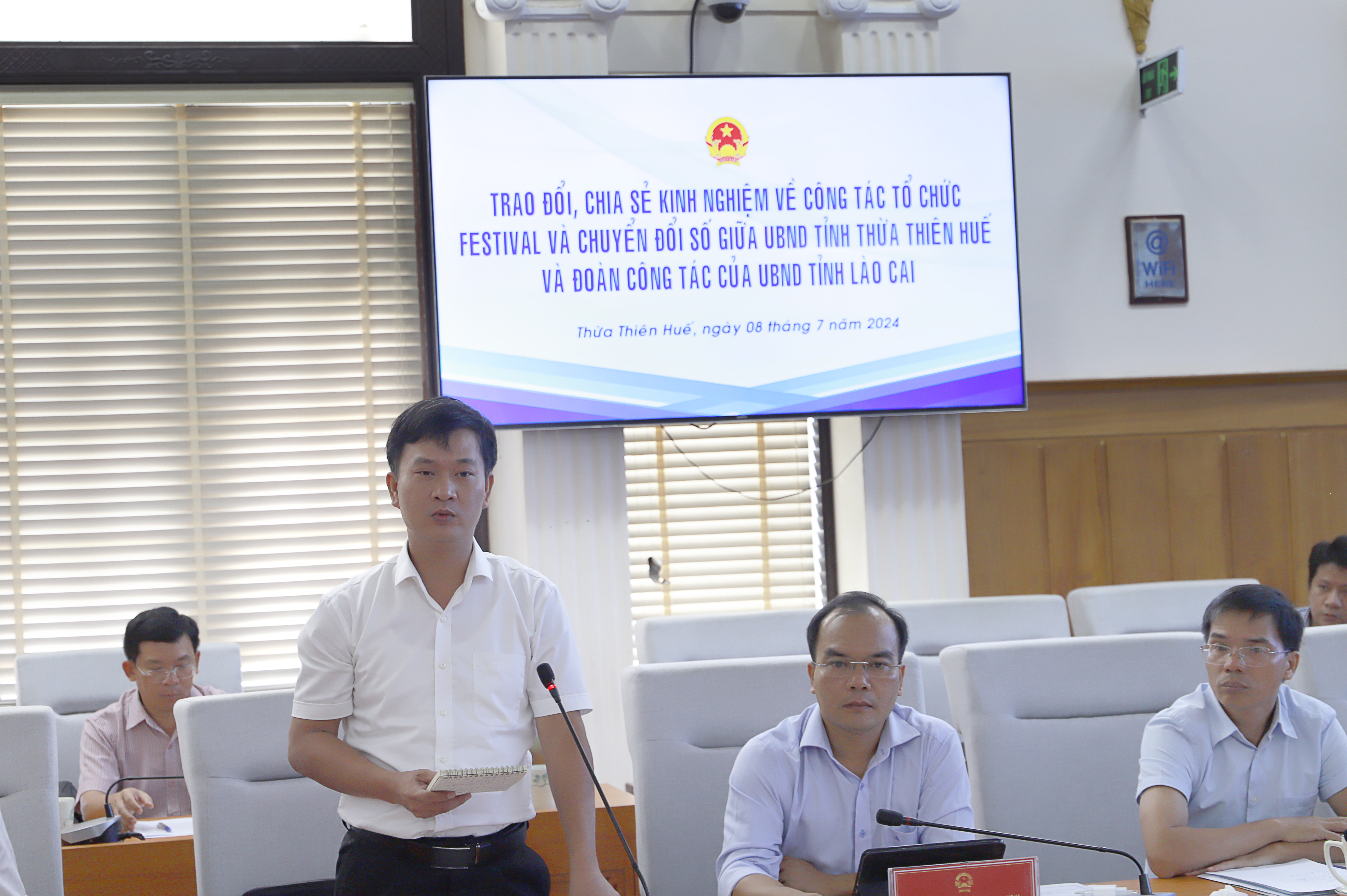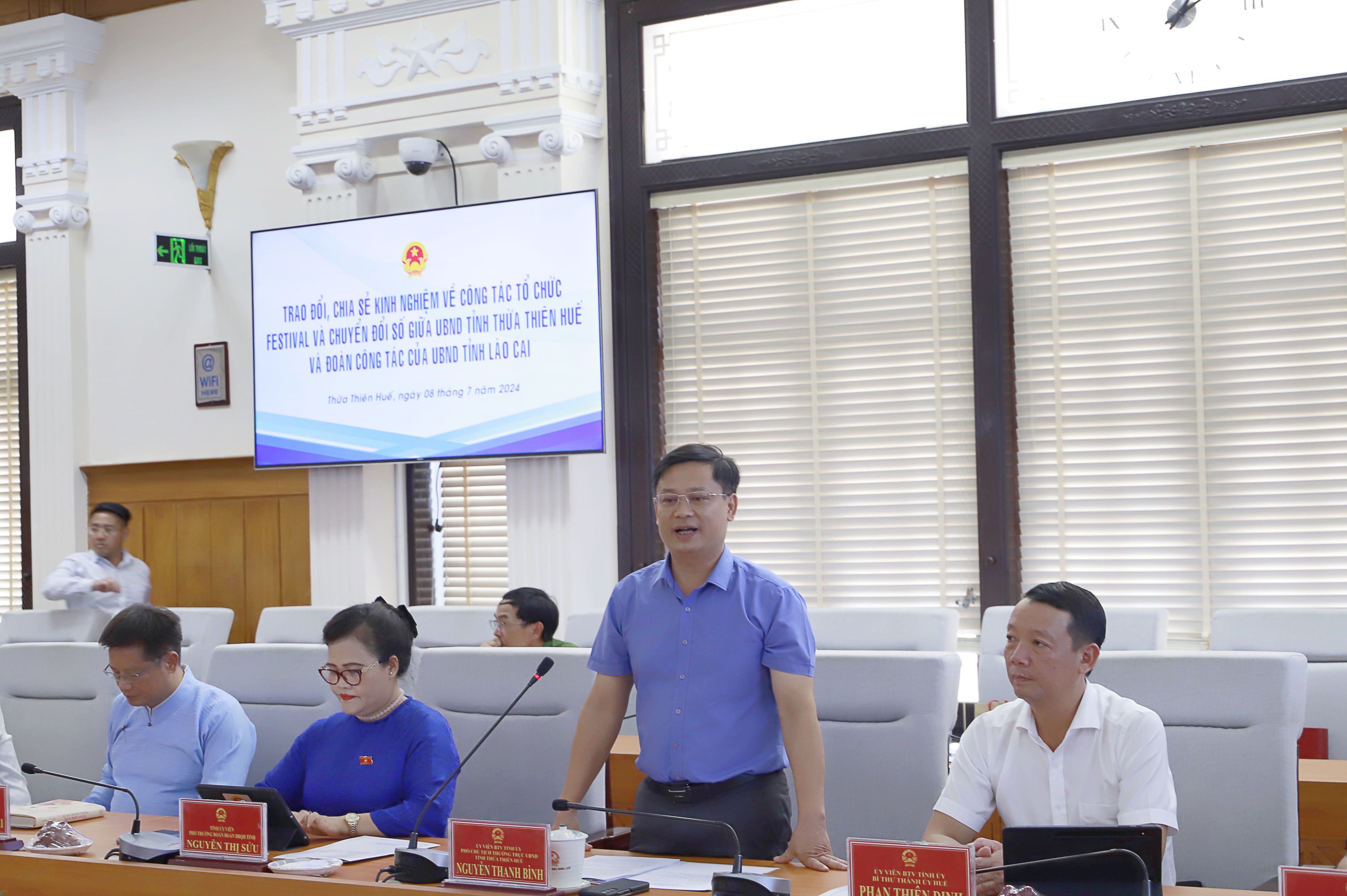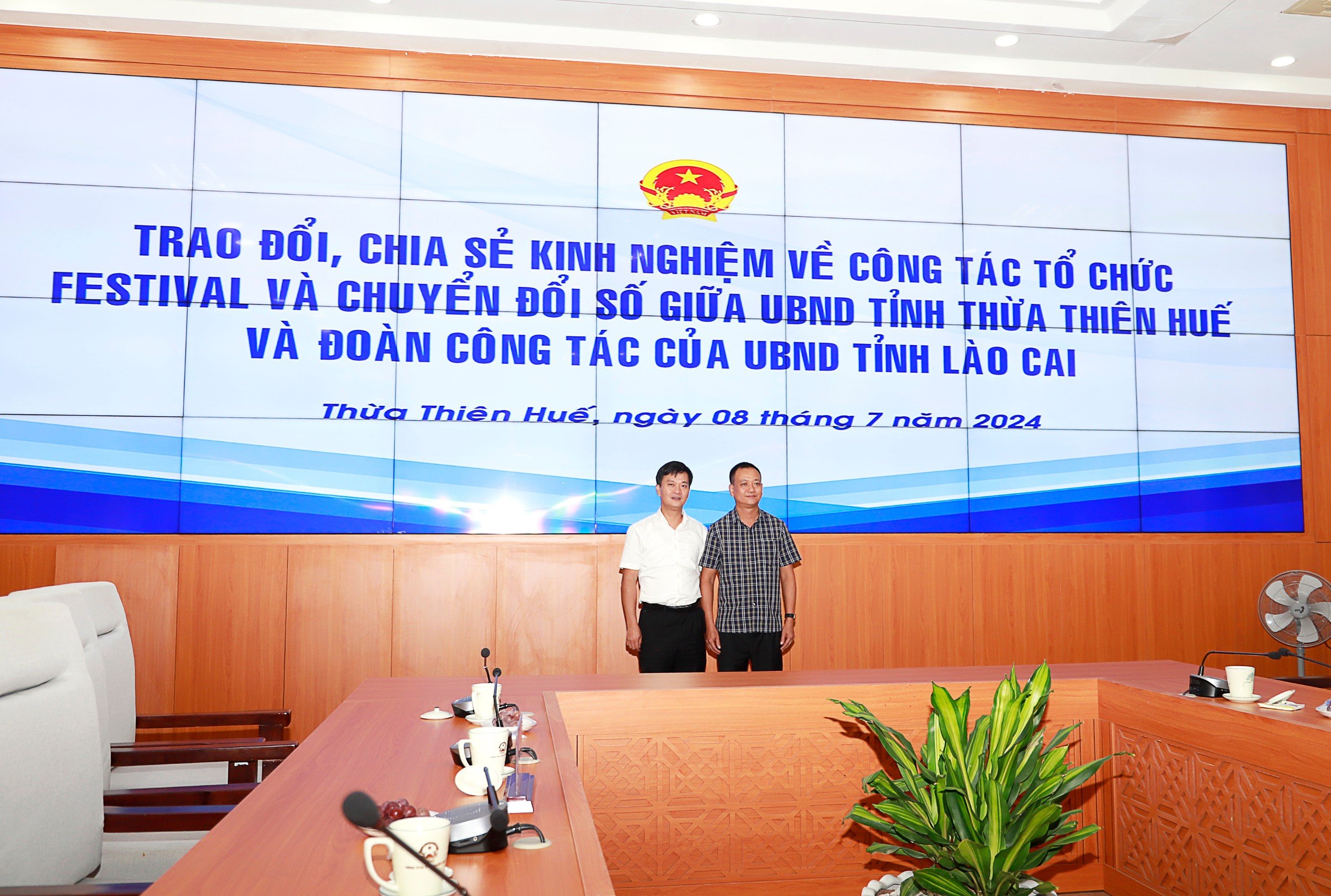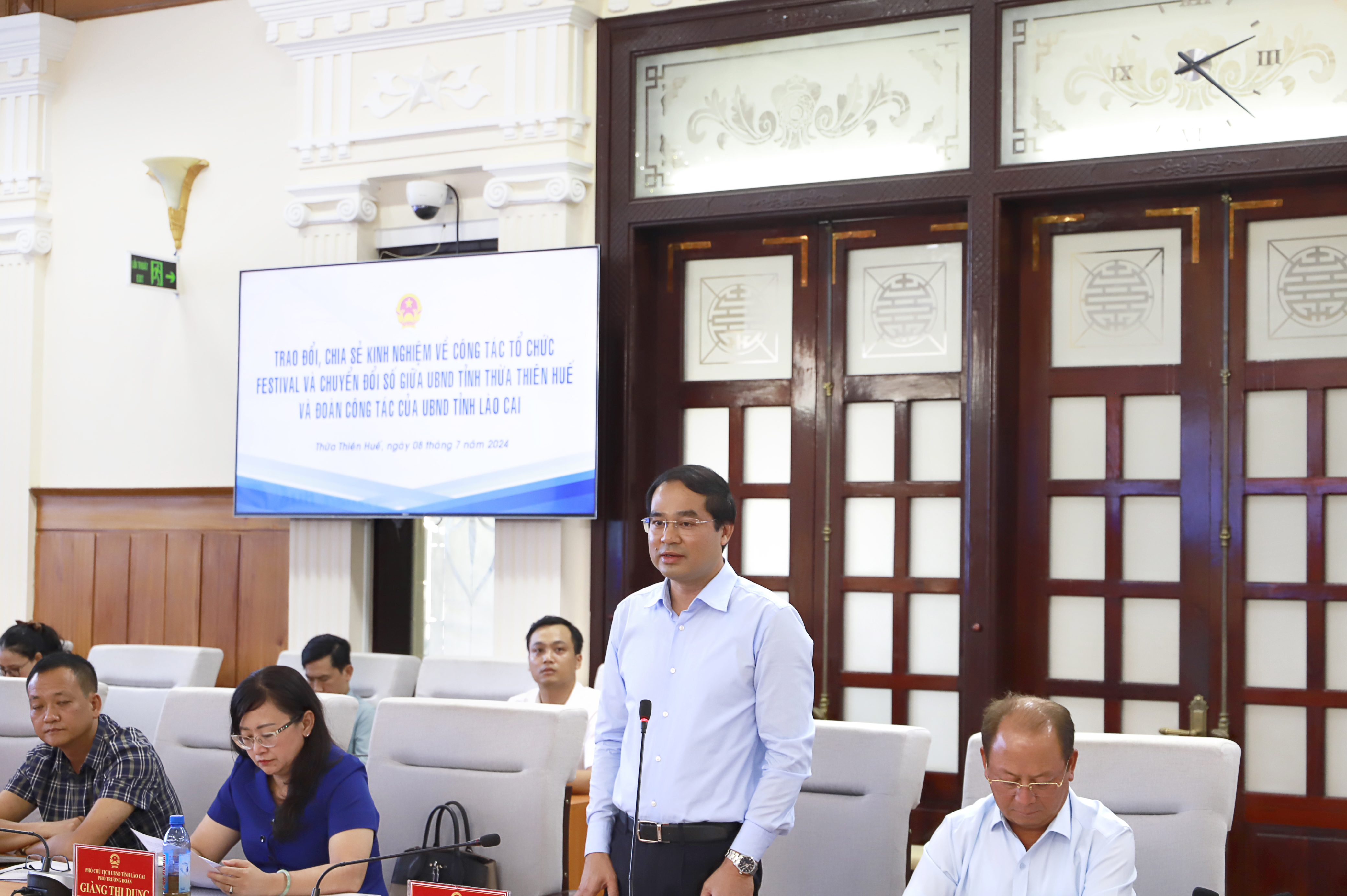 Trao đổi với lãnh đạo và các ngành liên quan của tỉnh Thừa Thiên Huế tại buổi làm việc, Chủ tịch UBND tỉnh Lào Cai Trịnh Xuân Trường đã đánh giá cao những thành tựu phát triển kinh tế - xã hội của tỉnh Thừa Thiên Huế, đặc biệt là những kết quả mà tỉnh Thừa Thiên Huế đạt được trong công tác tổ chức thành công các kỳ Festival Huế, triển khai ứng dụng CNTT xây dựng chính quyền điện tử, đô thị thông minh. Qua đó, với những kết quả đạt được trong chuyển đổi số đã tạo nên một diện mạo mới, với việc ứng dụng mạnh mẽ công nghệ thông tin, xây dựng chính quyền điện tử, chính quyền số, đô thị thông minh…đã đóng góp quan trọng vào nhiệm vụ phát triển kinh tế - xã hội của địa phương. Theo Chủ tịch UBND tỉnh Lào Cai Trịnh Xuân Trường những cách làm hay, sáng tạo, đột phá của tỉnh Thừa Thiên Huế trong công tác tổ chức Festival và chuyển đổi số sẽ là kinh nghiệm quý báu để tỉnh Lào Cai học hỏi, trao đổi kinh nghiệm góp phần thúc đẩy công tác phát triển văn hoá, du lịch và chuyển đổi số của tỉnh trong thời gian tới.