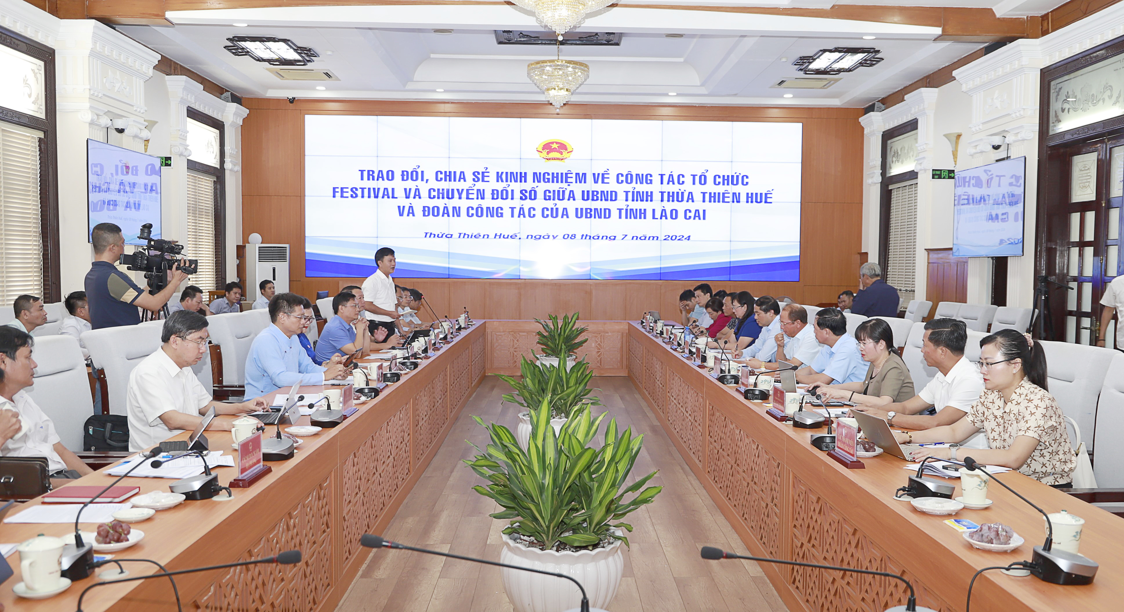 Chiều ngày 08/7/2024, tại Văn phòng UBND tỉnh đã diễn ra buổi làm việc về trao đổi, chia sẻ kinh nghiệm về công tác tổ chức Festival và chuyển đổi số giữa UBND tỉnh Thừa Thiên Huế và đoàn công tác của UBND tỉnh Lào Cai. UVTV Tỉnh ủy, Phó Chủ tịch Thường trực UBND tỉnh, Phó Trưởng ban thường trực Ban chỉ đạo chuyển đổi số và thực hiện Đề án 06 tỉnh Thừa Thiên Huế Nguyễn Thanh Bình chủ trì hội nghị.